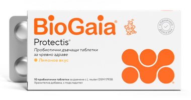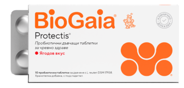 BioGaiа Protectis таблетки за дъвчене с вкус на ягода са хранителна добавка, съдържаща Limosilactobacillus reuteri Protectis. Те осигуряват сигурен, лесен и удобен начин за поддържане на адекватен брой бактерии в храносмилателния тракт.